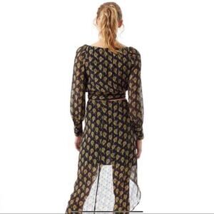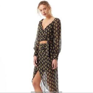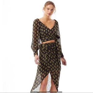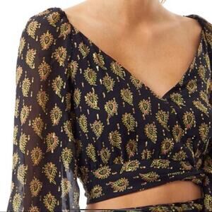 Stevie May State of Art Wrap Top Silk Blend. Woodblock Paisley Print - metallic gold. Slightly sheer blouson sleeves. Waist wrap tie closure. Silk Poly blend fabric. Partially lined. Size XS.
