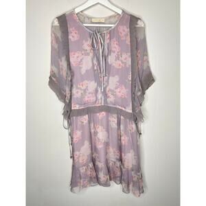 -A classic Stevie May shape is reimagined in a stunning lavender based print. Designed on crinkle georgette this mini has a V neckline, sheer style top with draped frills, cuffed sleeves