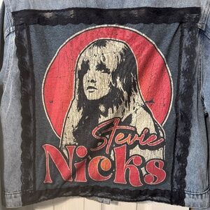 Stevie Nicks Upcycled Graphic T-Shirt & Jean Jacket - Leather & Lace Embellished. This was upcycled and handmade and embellished by me. The top of the border is black leather with black lace sewn on top. The sides and bottom border is just the black lace. This was all hand sewn by me. This is a brand new jean Vigoss jean jacket and tagged a size XL - read measurements for sizing.