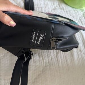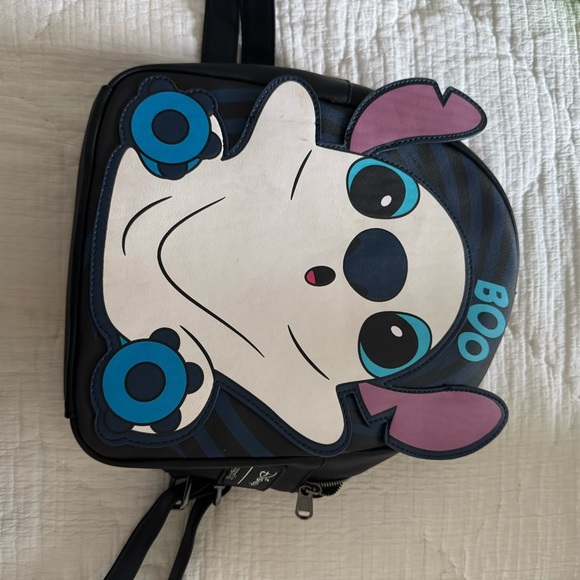 Adorable backpack featuring a cute stitch ghost character. Perfect for fans of playful designs. Main colors are black, white, blue, and pink.