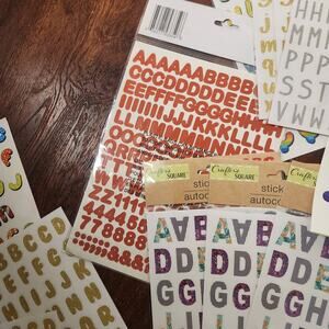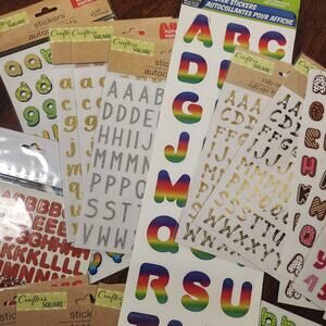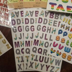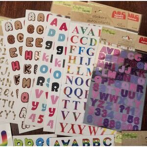 23 unused packages of alphabet stickers in misc. styles (packages contain misc. number of stickers, most between 56 and 83. The largest pack includes 370)