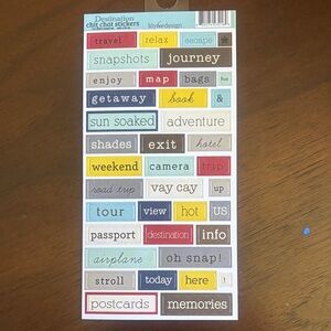 Colorful scrapbook stickers with summer and beach themes. Perfect for crafting and decoration. Lots of stickers. Travel beach themed. 13 pages of stickers. Hundreds of stickers for any craft project.