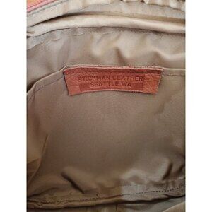 This is a Stickman Leather handbag, handmade in Renton WA. It's a beautiful bag, this style is no longer made. It is black and a reddish brown, all leather except for the inside lining is like a nylon material. The inside of the bag is excellent, no signs of wear. The bag does have a little rubbing of the leather in a couple of places. In the reddish brown colored areas, there is a little black scuffing to the area. None of these marks/scuffs came off with water and a cloth. I bet this bag would look amazing with some type of leather conditioning or treatment. There is one large zippered main area once you lift the black flap. The black flap has a zippered pocket on the underside. The main compartment has one large open pocket against the wall of the bag. There is another open pocket on the outside of the bag. There is another zippered pocket on the outside of the bag as well. All hardware is gold-toned (heavy).