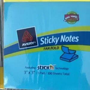 A set of Avery sticky notes and NoteTabs. Includes neon yellow, pink, blue, and purple sticky note pads. Includes gray translucent NoteTabs for page marking. Compact floral spiral notepad included. Useful for organizing and marking documents.