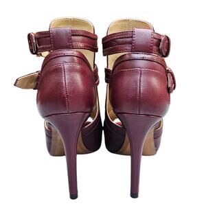 Burgundy wine (dark red with purple undertones) colored leather upper w/ gold tone hardware. Peep open toe, cutouts on side, high heel, mini hidden platform. Double buckle closure on sides. Issues noted in photos. Excellent preowned condition, overall. Size 7 by MICHAEL Michael Kors. Style: Blaze. Colorway: Oxblood.
