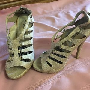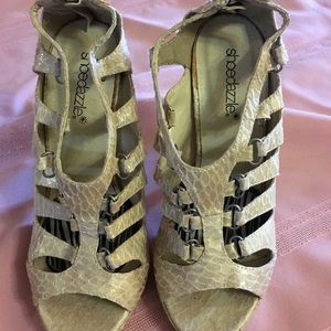 Reptile skin type strappy stilettos. Size 7. Worn only to see if I can wear them. Too high for me but in perfect condition.