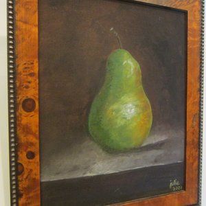 green pear, is mouth watering, on canvas board w inscribed detailing on the back, behind the secured paper cover.. situated on the updated tortoise style, golden beading vertical frame. condition is fabulous, prepared for hanging. Frame is 12" H. x 10"W. x 2" D & The art is 8" x 10" .