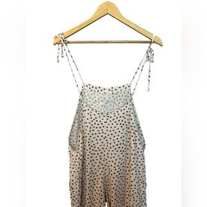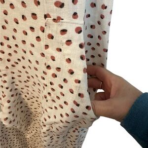 Tie Strap Overall features side pockets and adjustable tie straps. Cute Bixby Dot Linen fabric.