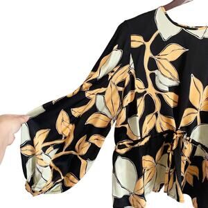 Playful yet refined, this Stine Goya Joy Ellis Blouse brings the brand’s signature artistic charm to everyday dressing. From the Joy Collection, this piece features a lively lemon-and-leaf print set against a sleek black base. Designed with voluminous long sleeves, a drawstring peplum waist, and a back keyhole button closure, it offers a flattering, feminine silhouette with modern polish.