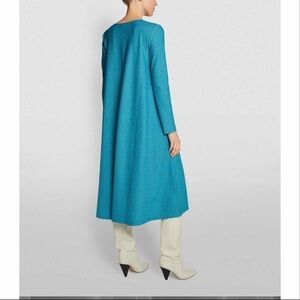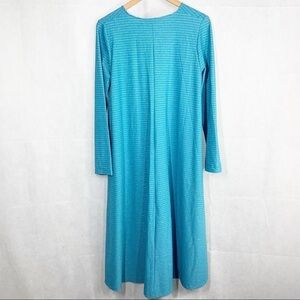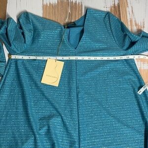 Stine Goya Lauren metallic midi dress in blue. Size small. New with tags, no flaws. Subtle glittery stripes lend an understated shimmer to the otherwise minimal midi profile. Long sleeve, unlined, v neck. Measurements are approximates only.