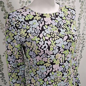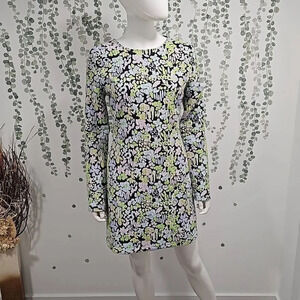 Slim-fitting mini dress with long sleeves and textured abstract pattern made from a recycled polyester blend.