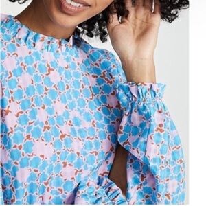 Sold out online! Christine Dress in Stardot print featuring a light blue, pink and red colour palette. This dress presents a loose-cut silhouette with a fitted waist and a peplum skirt. It is designed with ruffle details at collar and sleeve cuffs and is cut above the knee.