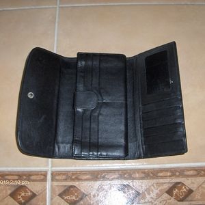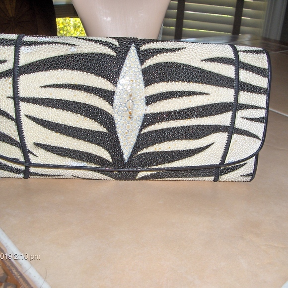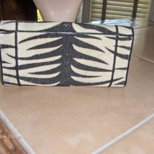 Tiger Stripe Sting Ray Wallet. Authentic. This wallet show a little wear from time be there are no tears or mars inside or out. It is very good condition. This is my own personal wallet that Ive used in the past however, I feel like it is a classic style and pattern do I have taken very good care of it. It has 14 slots for cards and one for D/L. It is made of genuine stringray skin. The color of the wallet is black and off white or cream.