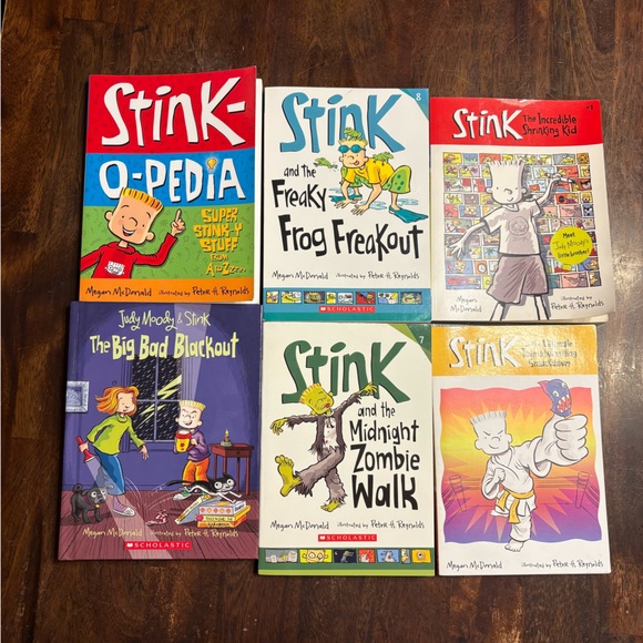 Set of six Stink books with colorful covers. Includes titles like 'Freaky Frog Freakout' and 'Midnight Zombie Walk.' Perfect for young readers.