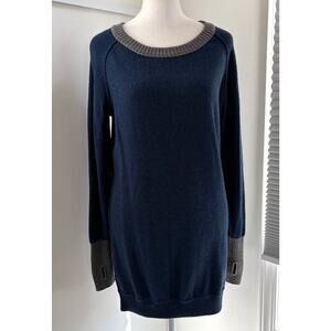 Stio Merino Wool Large Navy Blue Gray Sweater Ribbed Cuff Longer Length Warm