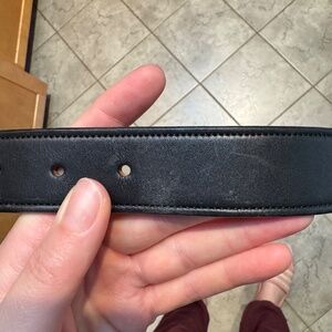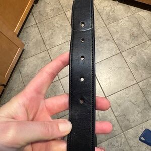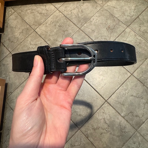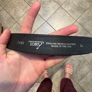 Equestrian chic - size 34 (on the small side!!) Tory leather belt, made in USA. Only used on last hole, at horse shows, so there is mark on last hole as pictured, and some very light scuffing/fading just at the end of the holes. This is quality, classic equestrian style so it runs small ( because the equestrian fashion community hates itself). Buckle is a stirrup iron.
