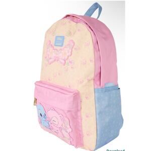 This full-size backpack features Stitch and Angel sitting together on a pink front pocket surrounded by flowers. The rest of the bag features an all-over print of pink flowers and some color-blocked sections of pink and blue.