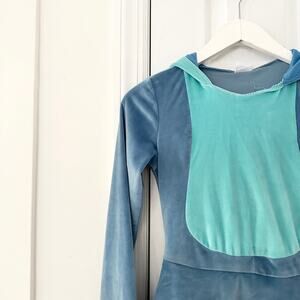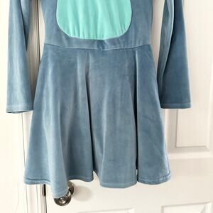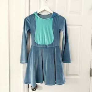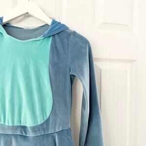 Size large big kid girls From Disney. Blue hooded Stitch swing dress. Long sleeves. Has partial lining on interior. Preowned in good condition with no stains or tears.
