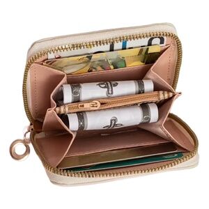 Features an inside zipper coin pocket, bill compartments and credit card slots.