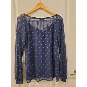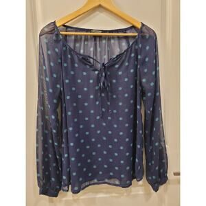 Navy blue sheer blouse with contrasting light green teal abstract print. Tie front neck and button sleeves. Elevated casual look can be paired with a slip dress and sneakers. Modest blouse is perfect for the office or date night.