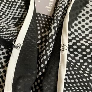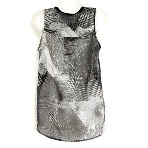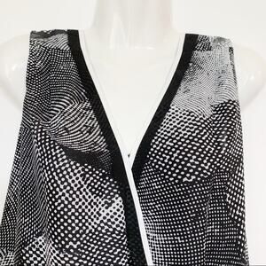 Black and white abstract print cross front top with raw edged black trim and white piping at v neck. Sleeveless, hi lo split hem, deep v neck with hook closure, woven fabric without stretch, loose fit.