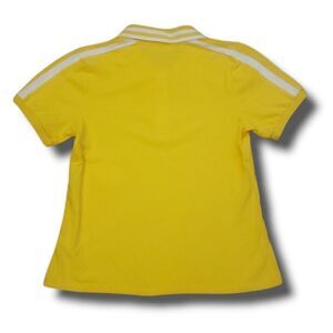 This yellow racer stripe polo is new with the tags. The extra button is still attached on the care tag. It features 2 white stripes coming down the shoulders into a short sleeve and 3 buttons down the front.
