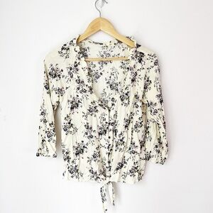 100% rayon This is a cream and purple blouse by Mason & Belle in an XS size. Features include ruffles v neck, floral pattern, waist tie and button down the front. Item is new with tags. No measurements are available for this item, please purchase based on size tag.