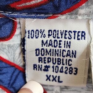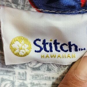 Pre-owned Stitch Hawaiian mens shirt, size XXL, in blue with bold floral print. Made of 100% polyester, lightweight and breathable. Features button front closure, chest pocket, and short sleeves. Carefully inspected, in good condition with light wear. Perfect for summer, vacation, beach, or casual outings.