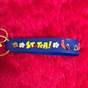 Cute Stitch keychain with a blue strap. Features a gold clasp.