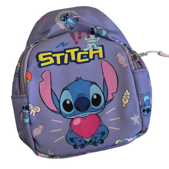 Adorable mini backpack featuring Stitch holding a heart on a lavender-purple background with all-over Stitch print. Compact size makes it ideal for toddlers, young kids, theme park days, outings, or as a cute character accessory for Stitch fans. Lightweight with adjustable straps and a zip-top closure for small essentials.