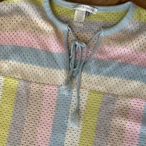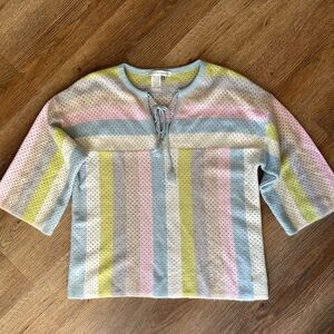 Stitch & Needle 100% cashmere striped sweater with front tie. Oversized fit with 3/4 sleeves and a mesh-like weave. Pretty pastel pink, blue, green and neutral colors. Perfect spring time transitional piece. Cashmere is in excellent condition with no pilling. Small stain near bottom hem but very unnoticeable.