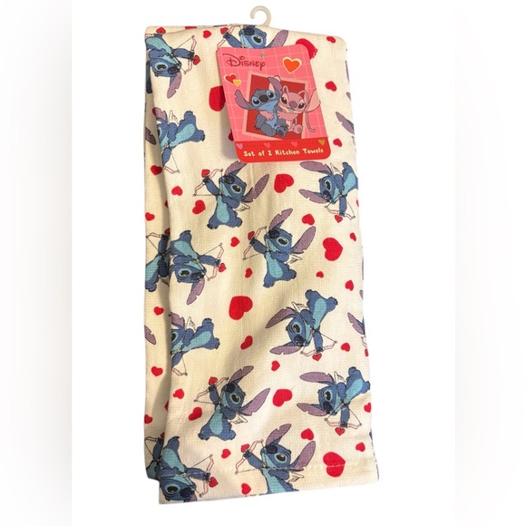 Set of 2 kitchen towels featuring Stitch with red hearts. Perfect for adding a playful touch to your kitchen.