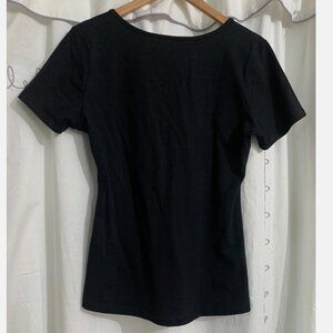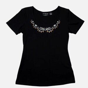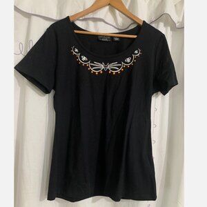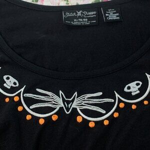 Design: Black short sleeve top with embroidered Zero, skulls, and orange dots at neckline