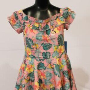 This off-shoulder dress, skater style with a ruffled neckline, features a beautiful tropical floral with peeks of your favorite UP characters.