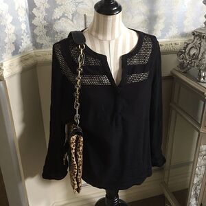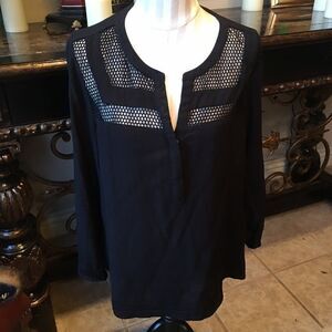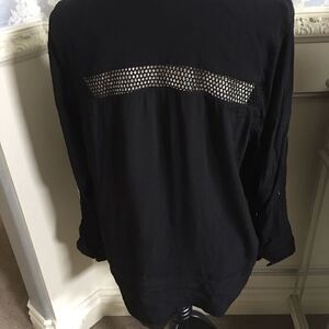 Stitch Fix Black Mesh Top- the mesh top & back strip look really awesome! It says XL but fits like a large! It has roll sleeve with button closure.Shanon Mesh Detail V Neck Top. See my measurements under arm!
