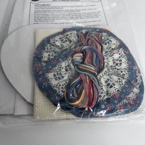 Kit contains cotton embroidery thread, 14 count ivory Aida, pre-gathered ruffle with lace, mounting board, needle, easy instructions