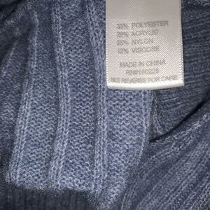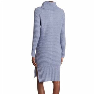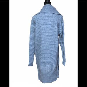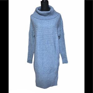 Blue dust cowl neck knit dress. Long sleeve. Side vented hems. 35% polyester/28% acrylic/25% nylon/12% viscose. Size: XL. Original price: $70.00. NWT.