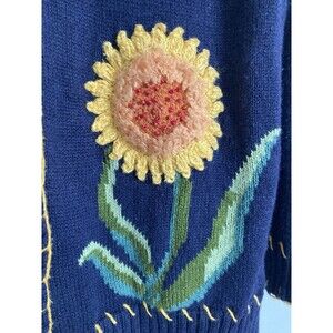 Vintage cardigan with sunflower appliqué and border stitching. Long sleeve sweater in cotton/ramie knit.