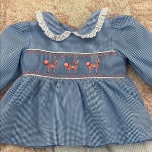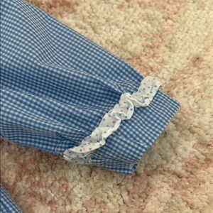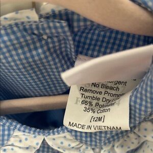 Adorable baby outfit with a blue ruffled top and white polka dot pants. Worn twice. Washed n Dreft hung to dry never put n dryer
