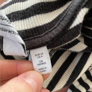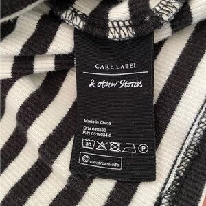 Elevate your wardrobe with this stunning Stockholm Atelier & Other Stories black and white striped ribbed top. The turtleneck design and long trumpet sleeves create a chic and sophisticated look that is perfect for any season. Made with a slim fit and jersey style, this top features a ribbed texture that adds a touch of elegance to your outfit. Whether you're dressing up for a formal occasion or going for a casual look, this top is versatile enough to fit any style.