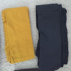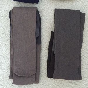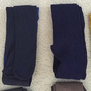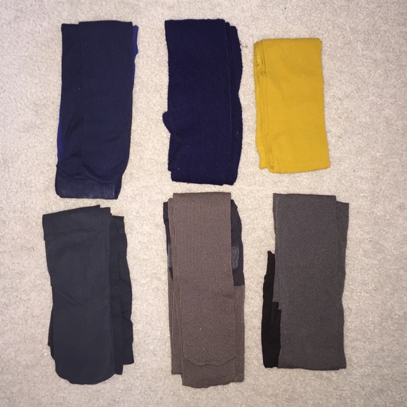 Colored Stockings Bundle! Top left to right: vertically ribbed navy & royal blue, navy w/ lace-like detail, chevron ribbed mustard yellow (all worn twice or less). Bottom left to right: slate gray, vertical ribbed light brown & grey, smooth deep brown (never worn). All purchased from Old Navy with the exception of top, middle, navy pair from Charlotte Russe. Dress up your skirts, short dresses, and long tees with stockings and booties. ALL ITEMS SOLD TOGETHER. PET FREE/SMOKE FREE HOME.