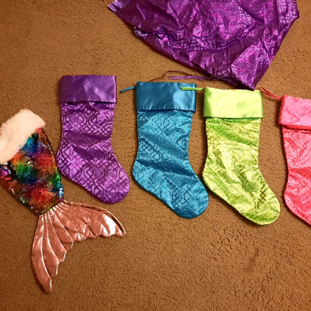 4 sparkly stockings with matching sparkly tree skirt and 1 sequins mermaid stocking all new.