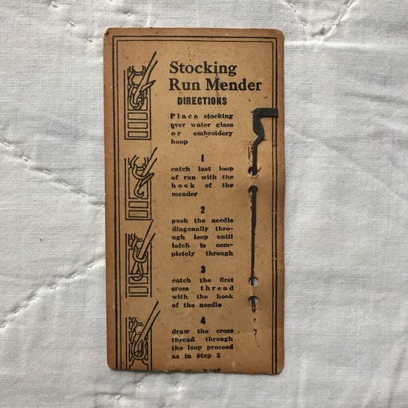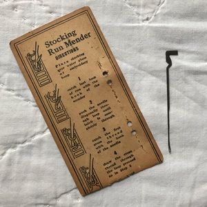 Vintage stocking run mender tool. Before the days of inexpensive pantyhose, women would mend their runs in stockings with such a tool. Includes original instruction card - but please note the card is torn and incomplete. The mender tool measures 2.75” in length. A delicate piece of women’s clothing history.