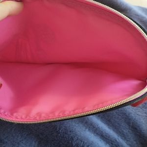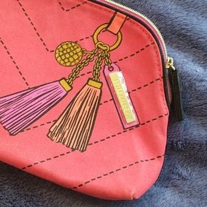 - Estee lauder red makeup bag, tassle/keychain print detailing w/clever brand logo keytag, pink interior &gold tone hardware, brand new unused