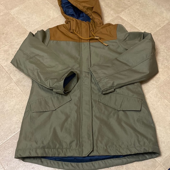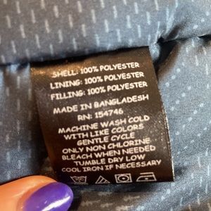 @afin5 thanks for the question! I’ll add a picture of the inside tag right now. The shell, lining, and filling of the jacket are 100% polyester. After a google search, it’s technically water-resistant.