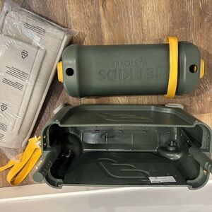 This Stokke ride-on suitcase in green is perfect for kids on the go. Featuring a sturdy design and convenient straps, it's ideal for travel adventures. Never used!