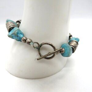 This exquisite bracelet is an artisanal masterpiece, showcasing a harmonious blend of dyed howlite stones and intricately designed silver tone beads. The toggle clasp not only ensures a secure fit but also adds a touch of elegance to the piece. Its rustic yet refined style makes it an ideal addition to any jewelry collection. Preowned