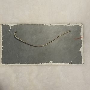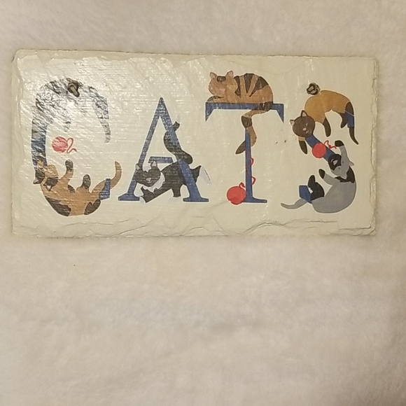 This is a unique sign made of a flat stone. Painted and has cats playing.