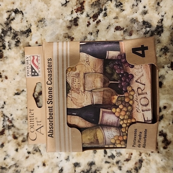 Set of 4 absorbent stone Coasters, new in package. Wine glass pattern, natural cork backing.