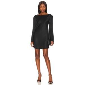 Stone Cold Fox Basier Mini Dress in Black. Size XS / Extra Small. Features boat neck, long sleeves, bias cut, crepe satin fabric, pullover style, and mini length. Style ACD2741 H23. 55% Rayon, 45% Viscose. Brand tag is partially damaged. Tiny pinhole near brand tag.